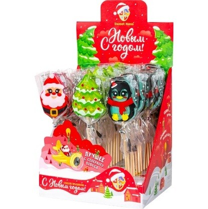 Натуральная карамель на палочке в форме маленьких новогодних символов: Деда Мороза, Елочки и Пингвина. Поставляемся миксом.