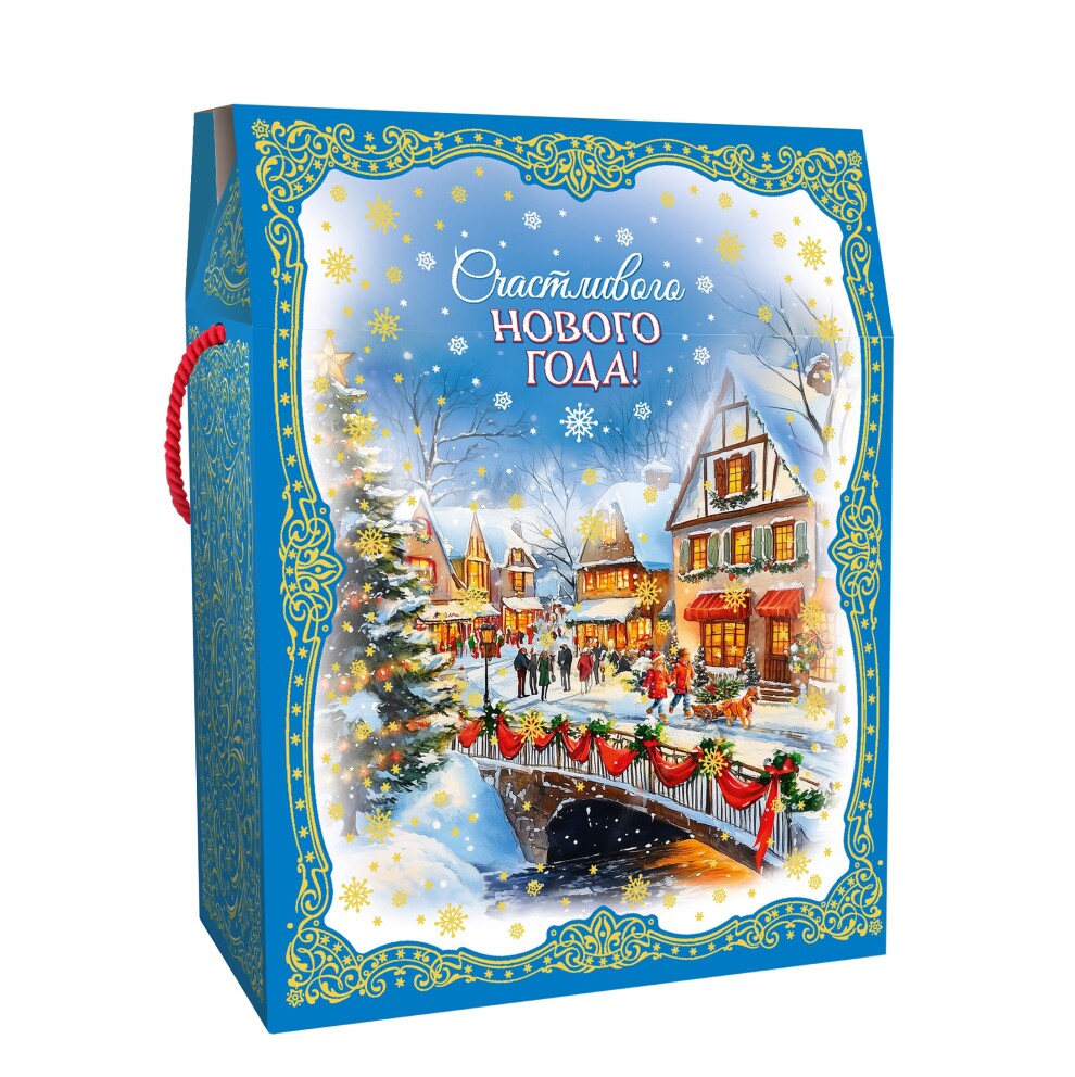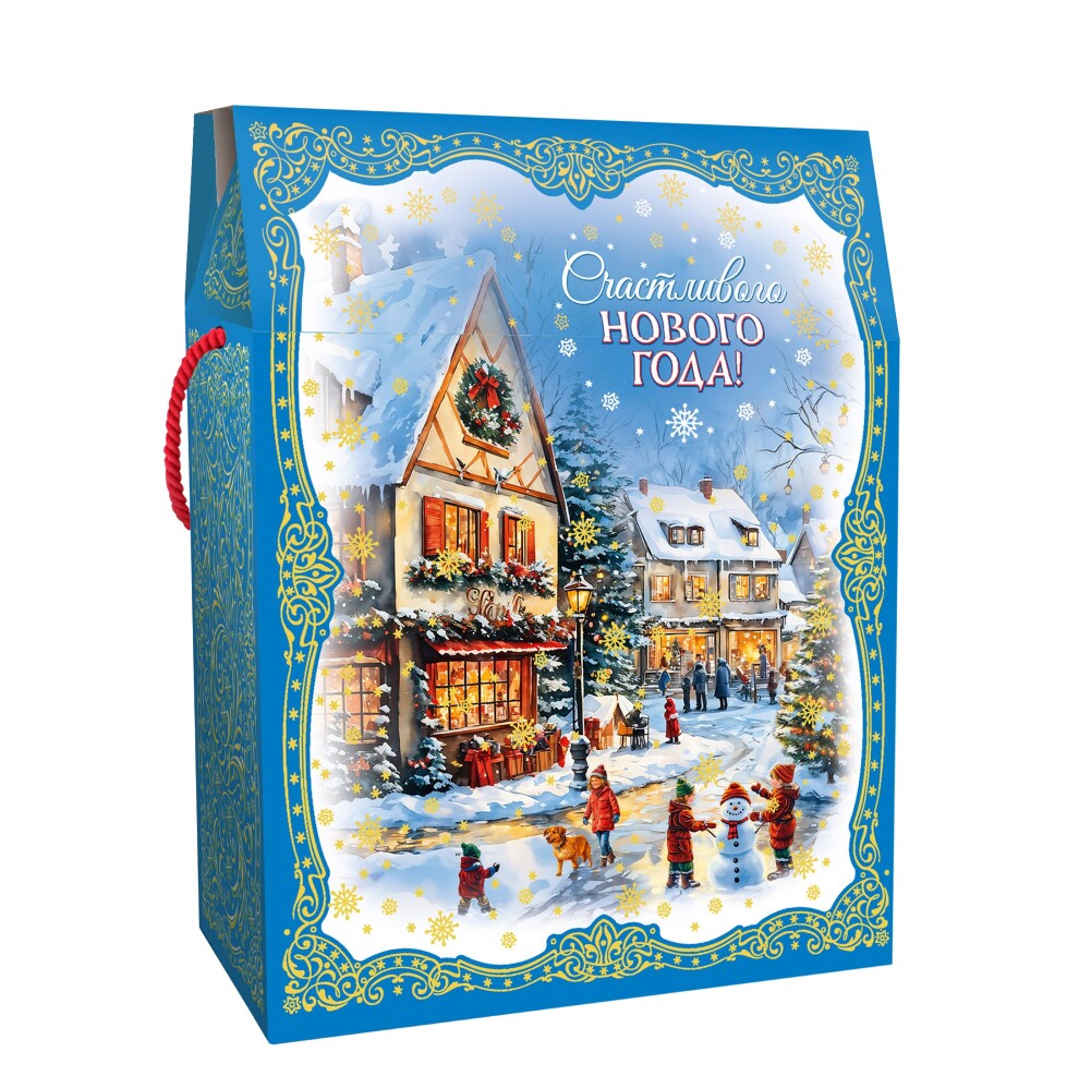 Новогодняя коробка из микрогофрокартона для подарка в форме сумки с веревочной ручкой.