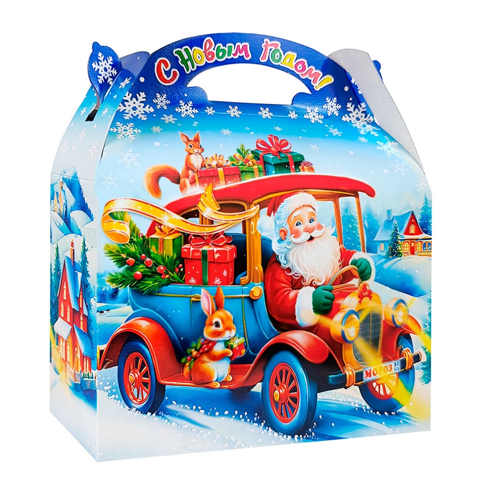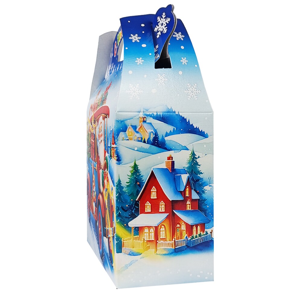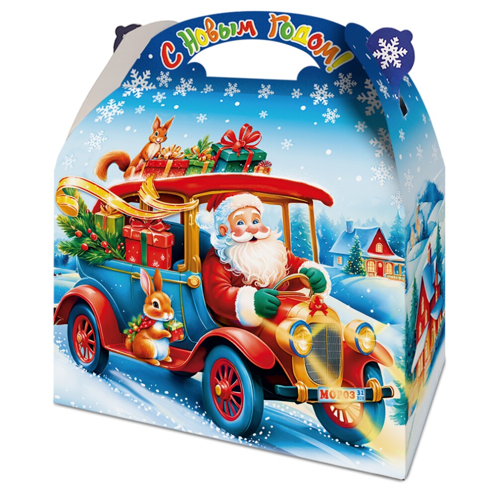 Новогодняя коробка из картона хром-эрзац для сладкого подарка Новый год мчится. На вес 1,2-1,3 кг конфет.