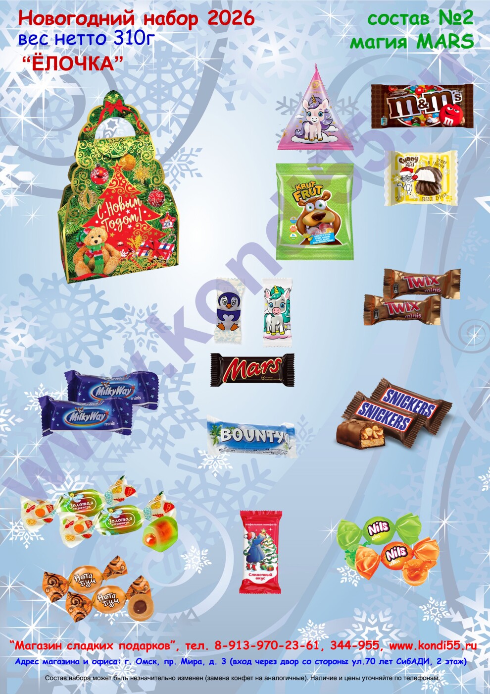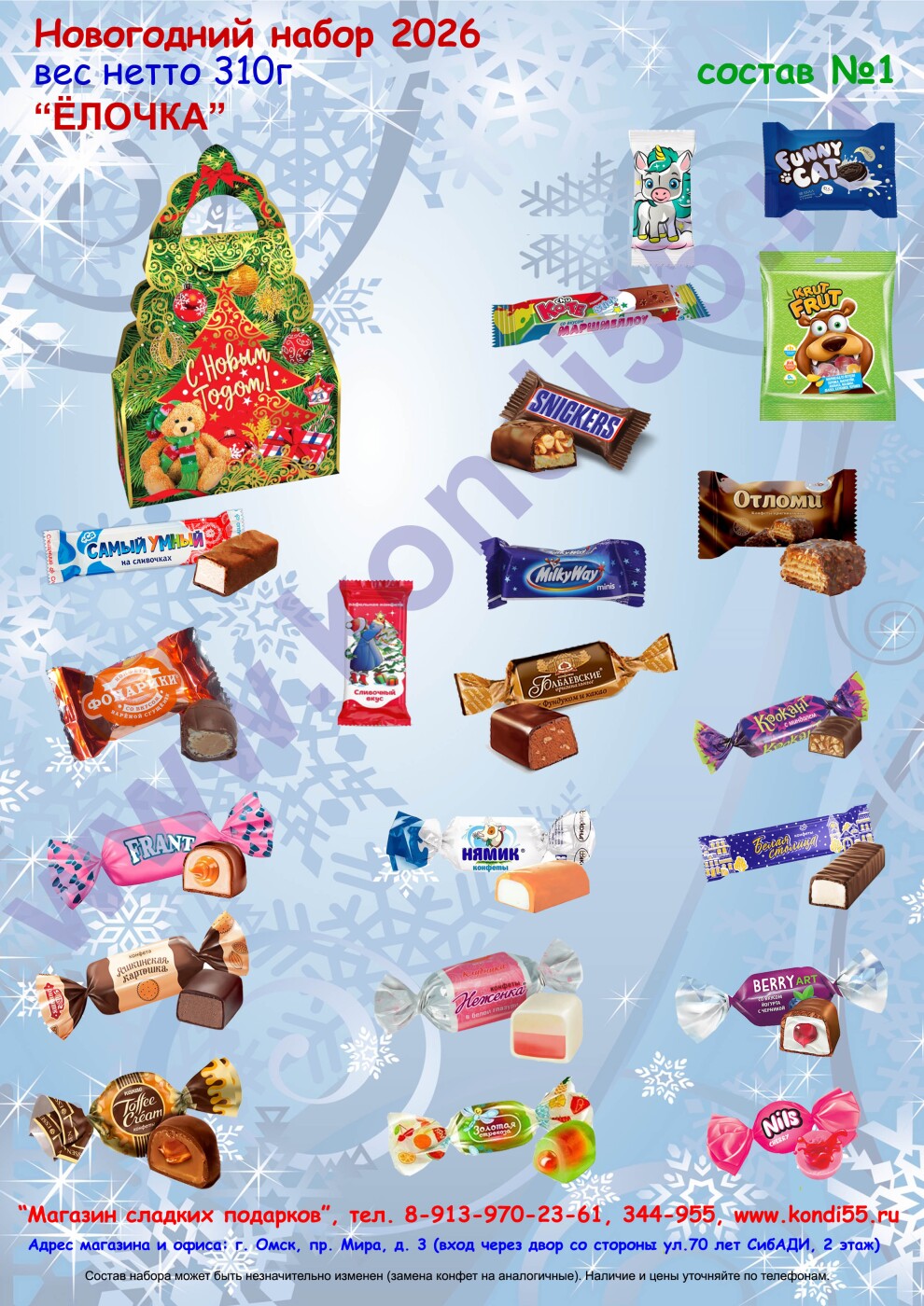 Вкусный шоколадный набор в новогодней картонной коробке Елочка. Нарядная упаковка с отделкой золотой фольгой, вкусные свежие конфеты от известных российских производителей подарят праздничное настроение!