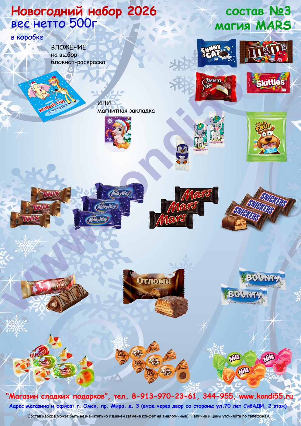 3 варианта состава: классический, оригинальный и с продукцией компании МАРС в основе (сникерс, марс, твикс, баунти, милви вэй, драже M$Ms, Скитлс и другие сладости)