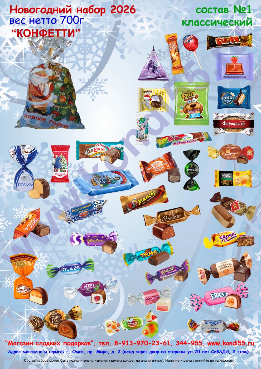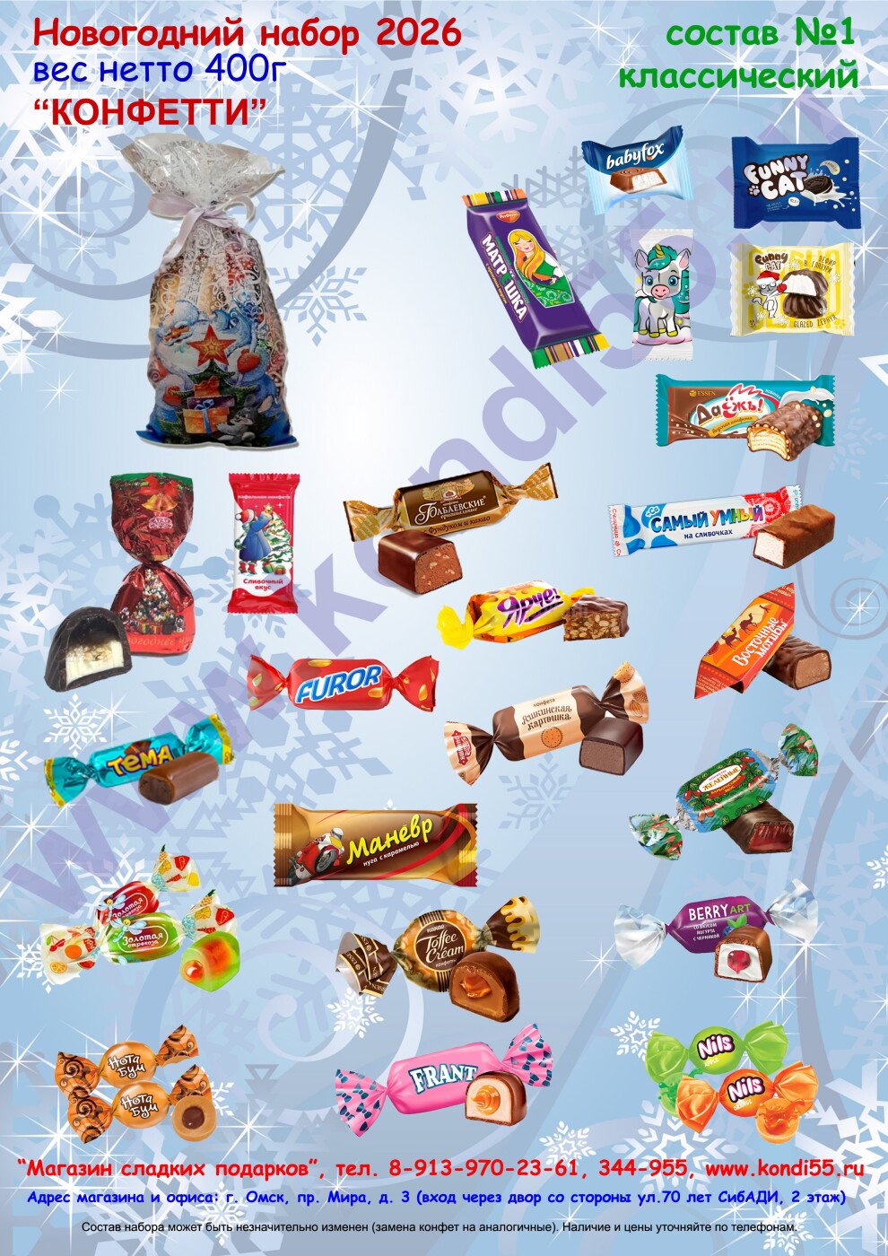 Вес нетто сладостей: 400г / 700г / 1000г