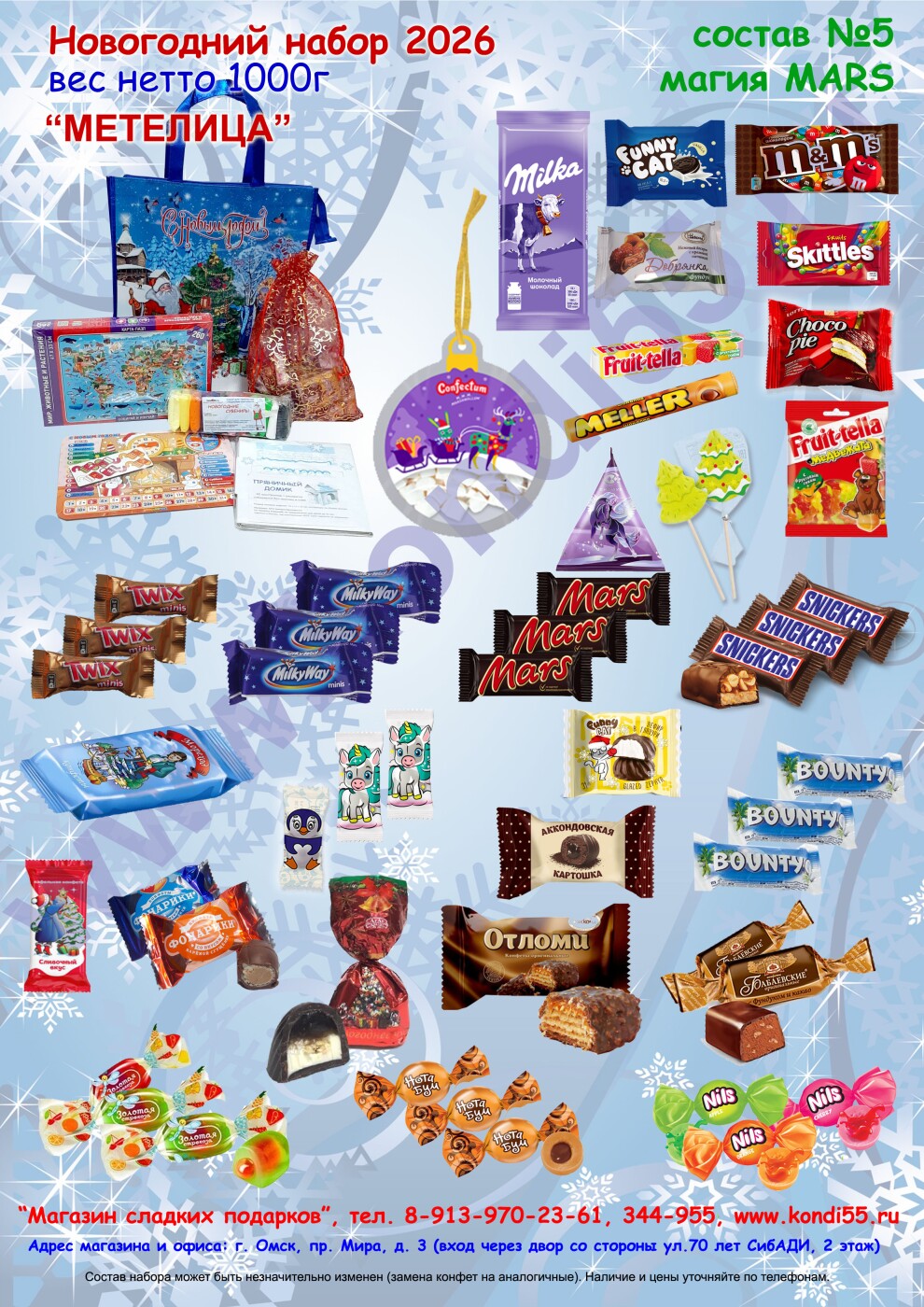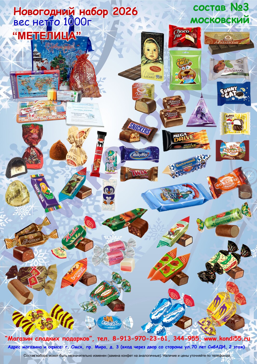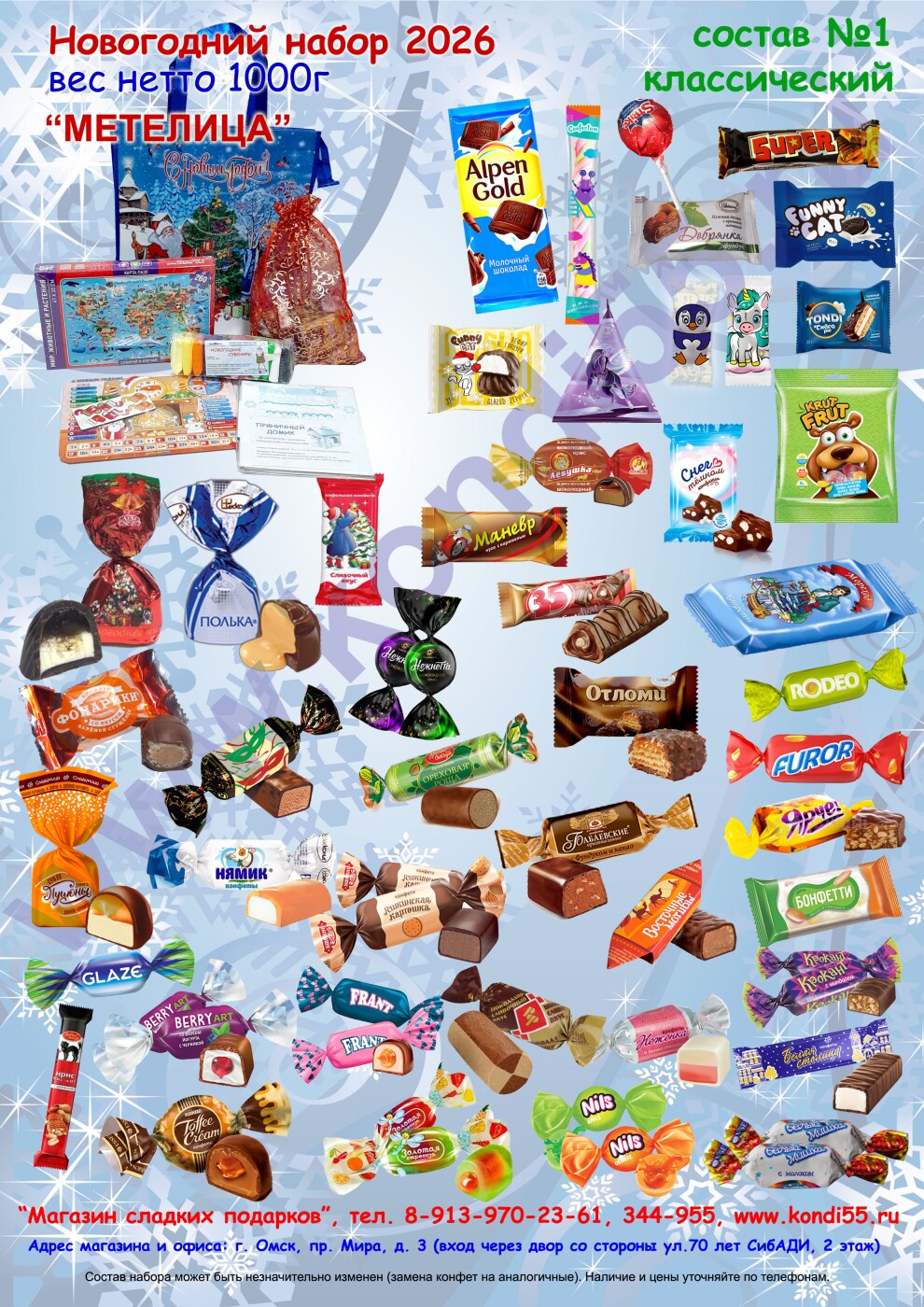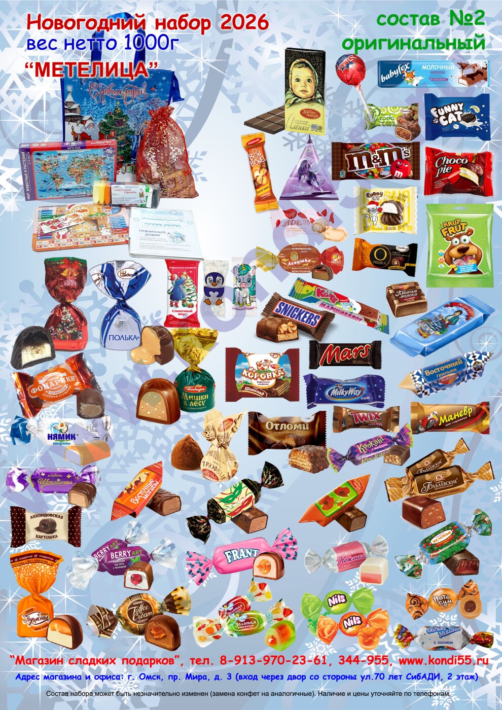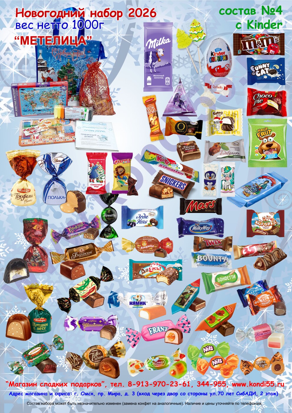 Классические составы, подарки из конфет московских фабрик (Объединенные кондитеры), наборы с любимой продукцией Киндер, а также вариант с максимальным количеством сладостей известных современных брендов (Mars, Meller, Frutella и тд.).
