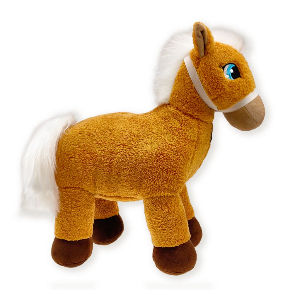 Новогодний подарок МИГЕЛЬ в упаковке - мягкой игрушке в форме коня. Символ 2026 года. Большая игрушка из искусственного меха с ворсом средней длины.