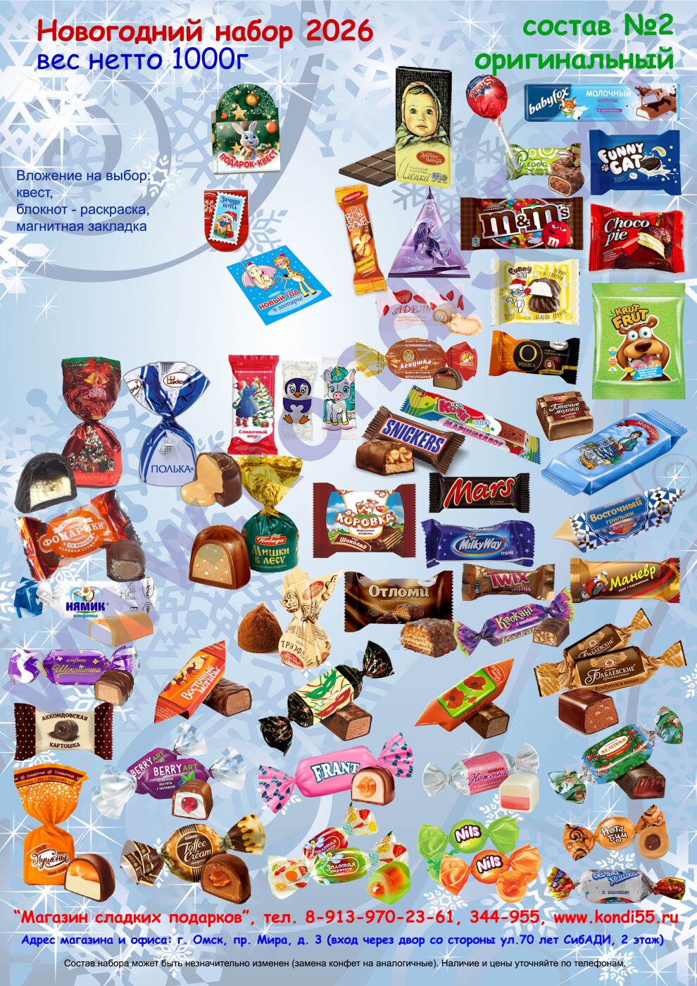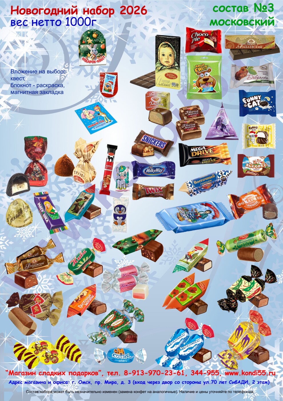 Внутри классический состав шоколадных конфет и шоколада от лучших кондитерских фабрик России.