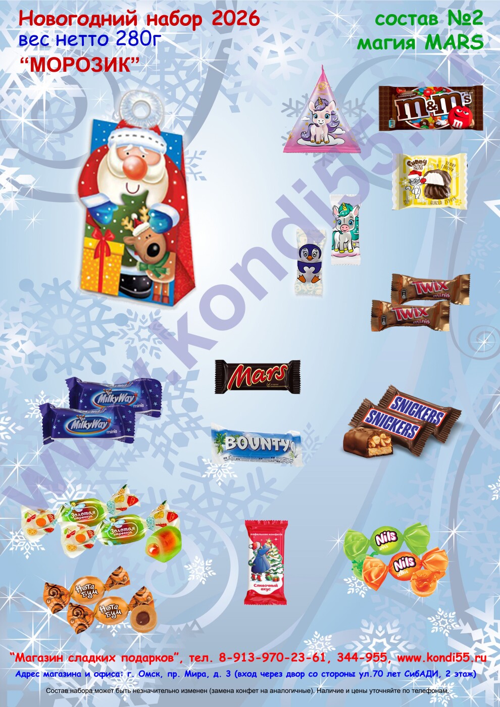 Два варианта состава: классический и из серии "Магия MARS" (с продукцией сникерс, милкивей, марс, твикс, баунти, м&ms, скитлс и другой, которую любят наши маленькие сладкоежки)