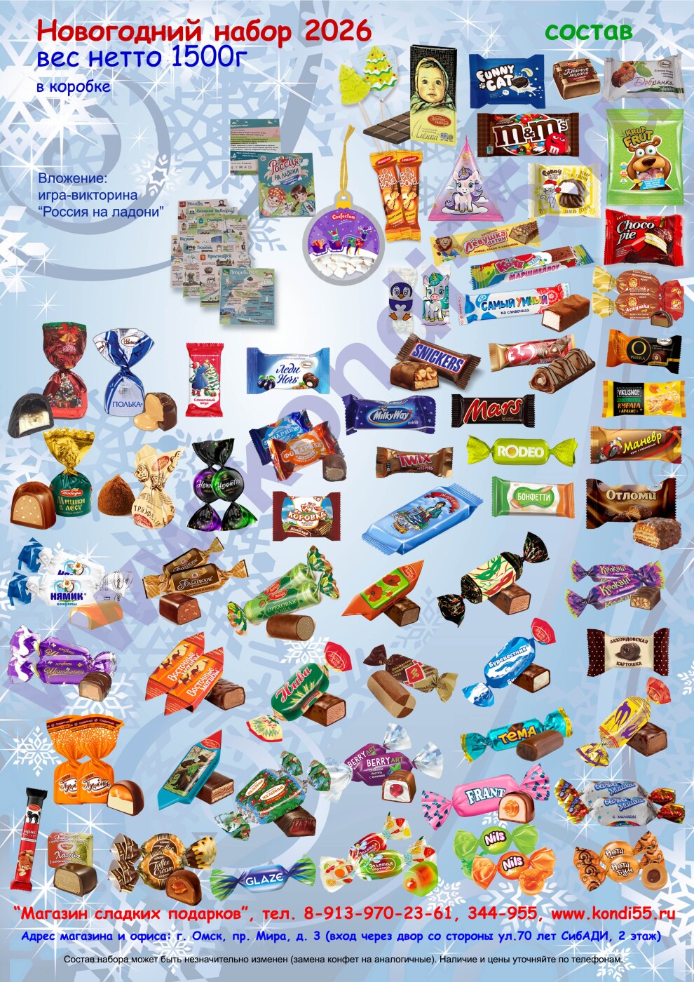 В подарке - игра-викторина "Россия на ладони", а также маршмеллоу в новогодней подвеске на елочку.