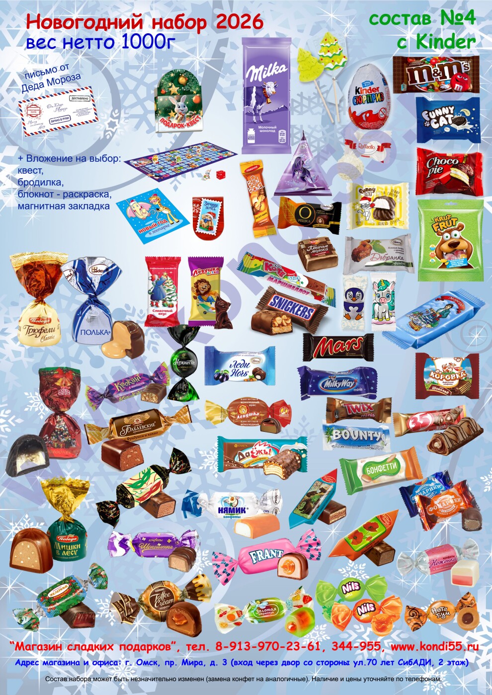 Классические составы, подарки из конфет московских фабрик (Объединенные кондитеры), наборы с любимой продукцией Киндер, а также вариант с максимальным количеством сладостей известных современных брендов (Mars, Meller, Frutella и тд.).