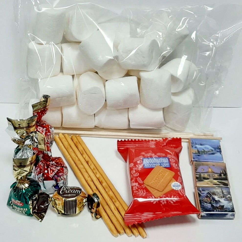 В наборе: маршмеллоу 200г, печенье сахарное 44 гр (4 шт), конфеты купольные 5 шт, мини-шоколадки 3 шт, 5 шоколадных конфет (сникерс, марс, баунти, твикс, милки вэй), соломка 75г, палочки деревянные для снеговичков, новогодняя коробка - игра Окавока.