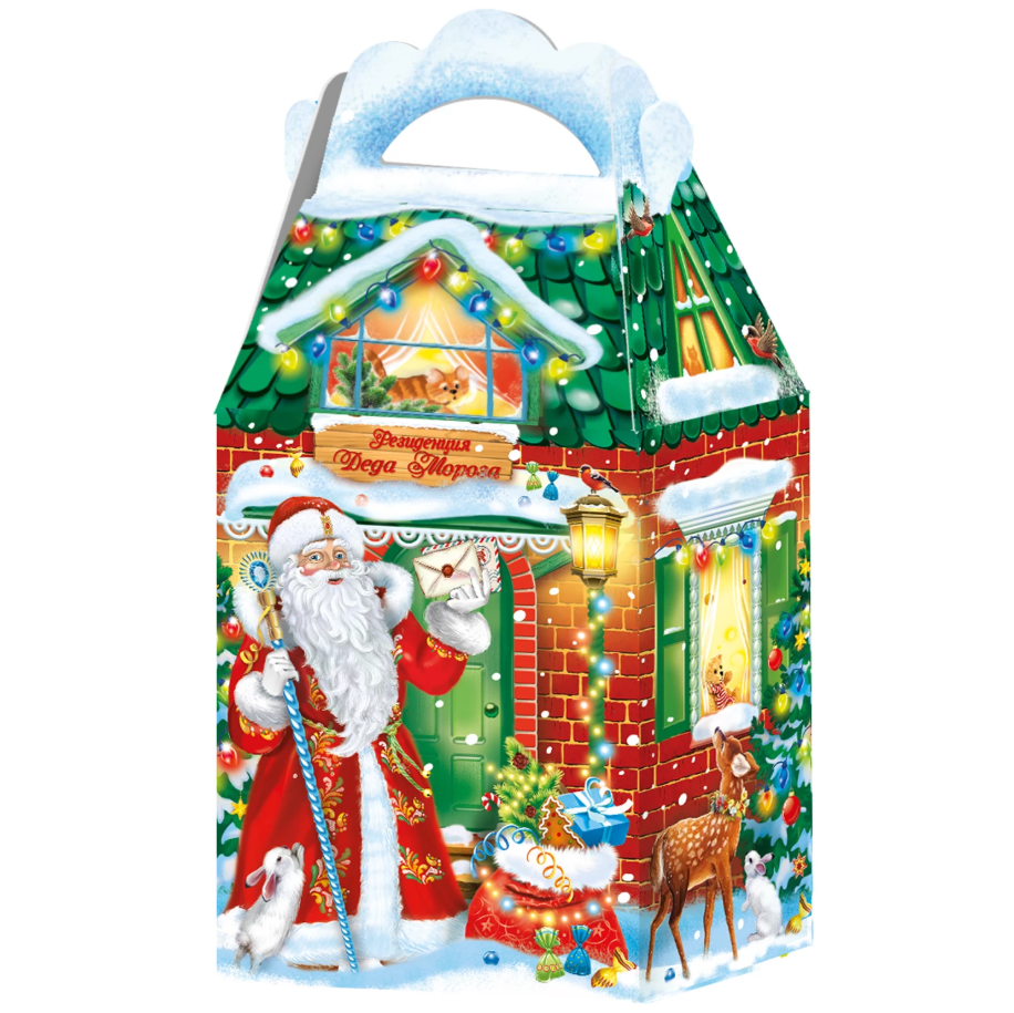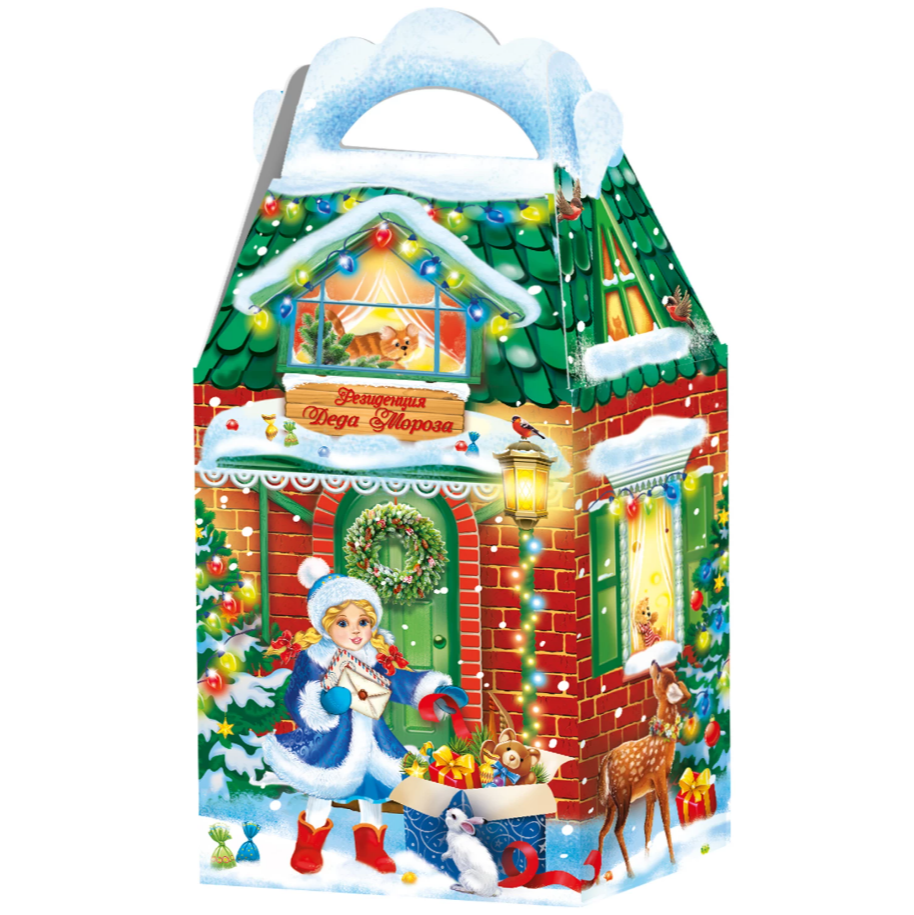 Новогодний сладкий подарок к 2026 году в подарочной коробке из прочного микрогофрокартона с Дедом Морозом и Снегурочкой. В гостях у сказки.