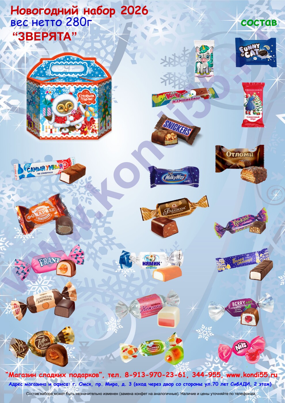 Вкусный шоколадный набор в новогодней картонной коробке ЗВЕРЯТА. Нарядная упаковка в форме шестигранника, вкусные свежие конфеты от известных российских производителей подарят праздничное настроение!